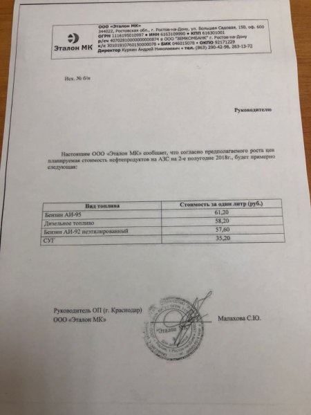 Листовка, которую распространили в сообществах города, представляет собой утвержденные цены на бензин и ДТ, которые появятся во втором полугодии 2018 года. В результате стоимость АИ-92 вырастет до 57,60 рублей/литр, 95-й обойдется россиянам в 61,20 рублей/литр, а дизель будут предлагать за 58,20 рублей/литр.